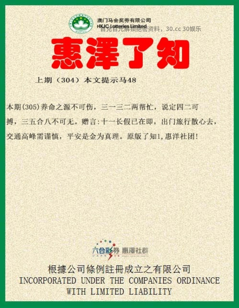 【惠泽了知】305期:养命之源不可伤,三一三二两帮忙,说定四二可搏,三五合八不可无。赠言:十一长假已在即,出门旅行散心去,交通高峰需谨慎,平安是金为真理。原版了知1,惠洋社团!